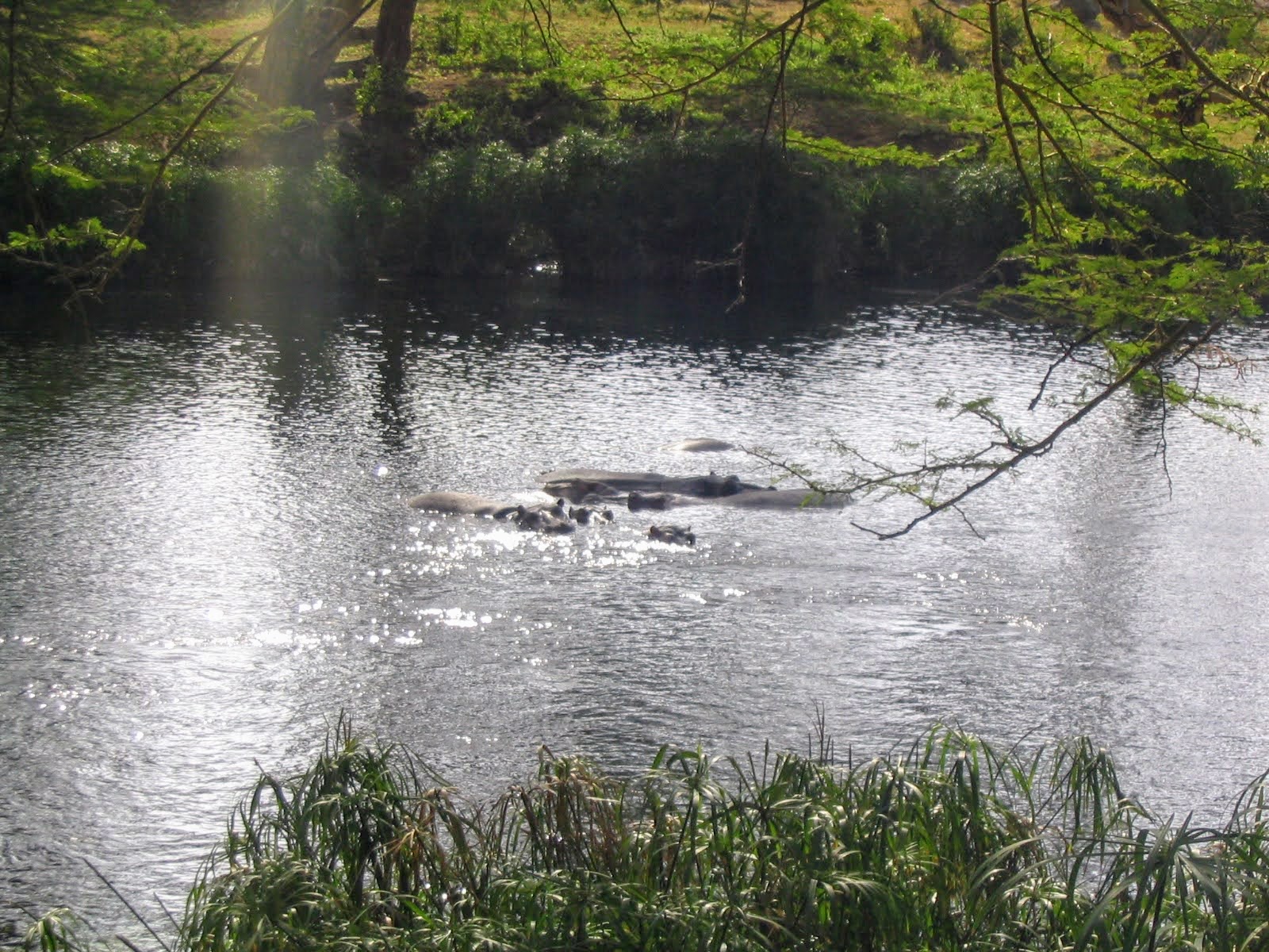 Io ho dormito come un ghiro nella nostra stanza: ieri, all’arrivo, mi ero caldamente lamentato con la direzione per la posizione troppo laterale rispetto al laghetto: mi avevano risposto che apparteneva all’ala di nuova costruzione ed in effetti era molto curata e con i bagni in granito. I nostri compagni di avventura hanno invece passato la notte sotto le lenzuola, usate come tenda da campeggio, perché dal soffitto piovevano gechi! Ripartiamo con il furgone di ieri: lo Tsavo Ovest, come scrivevo nel post precedente, più che per l’aspetto faunistico è famoso per i suoi paesaggi. Il limite fisico che separa le due parti del parco è dato dalla strada che collega Nairobi a Mombasa. Il furgoncino si inerpica lentamente sulla strada sterrata sulle alture che caratterizzano lo Tsavo Ovest: una ricca vegetazione fatta di foreste pluviali caratterizza questa zona, ogni tanto si vede qualche baobab. Siamo ai confini con la Tanzania e si può chiaramente vedere la sagoma conica del Kilimangiaro con la cima innevata. Ben presto arriviamo a Mzima Springs una zona caratterizzata da una serie di sorgenti naturali che danno vita ai corsi d’acqua e ai laghetti della zona: in acqua sguazzano numerosi ippopotami che sembrano paciosi ma tanto paciosi non sono. Il posto è meraviglioso. C’è una struttura in legno parzialmente sommersa che, attraverso grandi finestroni, permette di vedere sott’acqua i pesci e gli ippopotami nuotare.