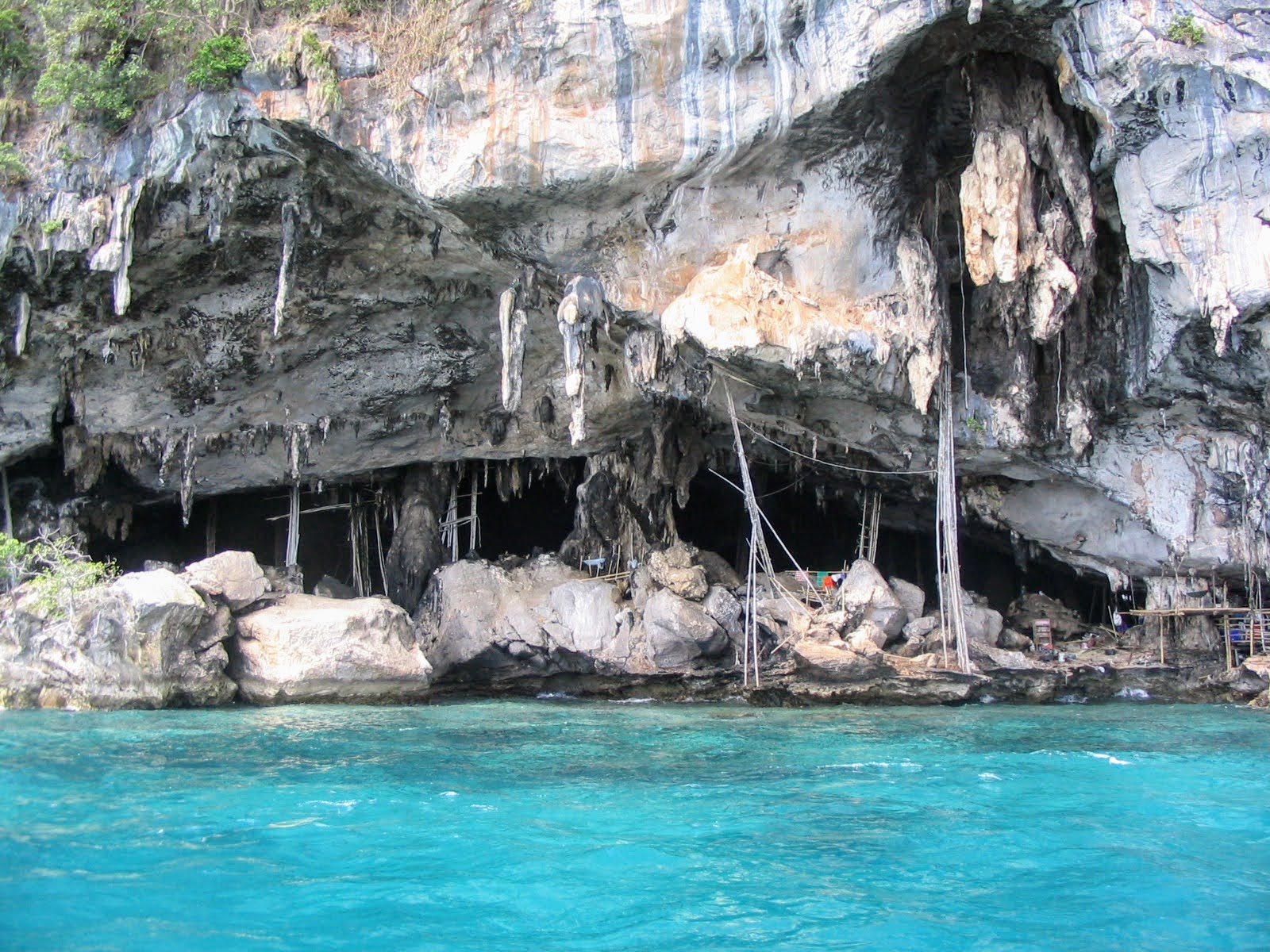 Arriviamo presto a Koh Phi Phi Leh, la più piccola delle due isole, che è completamente priva di strutture abitative. All’interno dell’isola, quasi protetta da due ali di roccia calcarea completamente ricoperta di vegetazione, si apre Maya Bay, la location principale del film The Beach. E’ un angolo di paradiso: una piccola spiaggia di sabbia bianca con alle spalle una foresta. Non so cosa pagherei per poter stare qualche giorno qui, da solo con una tenda. Un po’ come quando, durante l’estate dopo la maturità, sono stato in Grecia sull’isola di Moni, deserta, abitata solo da stambecchi e pavoni. Le uniche costruzioni erano i bagni e una baracca-cucinotto dove, due volte al giorno, una vecchietta arrivava, con una barca di pescatori, per cucinarci qualcosa. In tutta l’isola eravamo in sei. Bei tempi quelli!Con il motoscafo, circumnavighiamo tutta l’isola, infilandoci tra le insenature in paesaggi da favola. Le onde erodono la roccia calcarea alla base e l’effetto è quasi di sospensione. L’acqua è colore smeraldo, trasparentissima. Naturalmente è d’obbligo una sosta per sguazzare in quest’acqua cristallina.