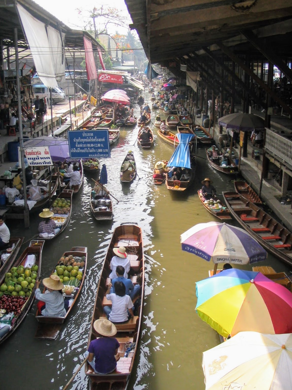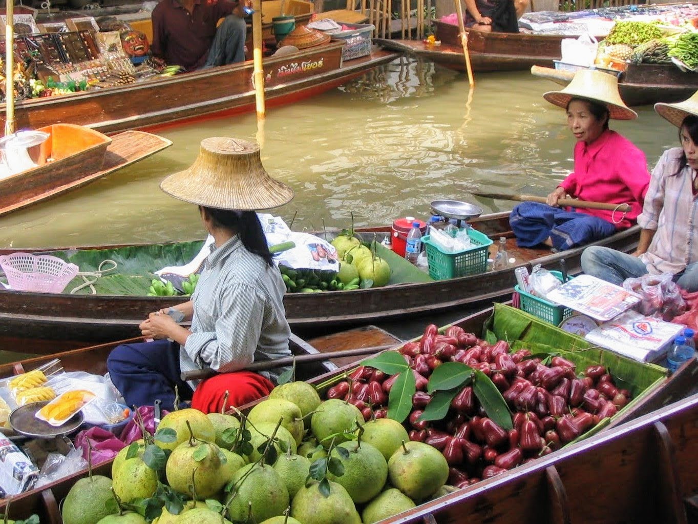 Il mercato galleggiante, che una volta era ad uso e consumo della popolazione locale, adesso è diventato soprattutto un’attrazione turistica. Resta comunque estremamente affascinante. Nella parte coperta, sotto grandi capannoni, ci sono enormi tavoli dove si trova veramente di tutto, da souvenir a bellissimi tessuti. Non mancano anche qui le robe taroccate: per esempio, la famosa polo con il coccodrillo viene venduta per l’equivalente di 3,50 euro ed è indistinguibile da una originale! La parte più suggestiva resta comunque quella che si trova sull’acqua. Qui, su tipiche imbarcazioni chiamate sampan, le donne, con caratteristici cappelli in paglia, vendono soprattutto frutta e verdura che, all’occorrenza, cucinano al momento; gli uomini invece vendono souvenir o merce tarocca. La vista dal ponte che attraversa in canale è incredibile: ora mi sento davvero in Estremo Oriente!