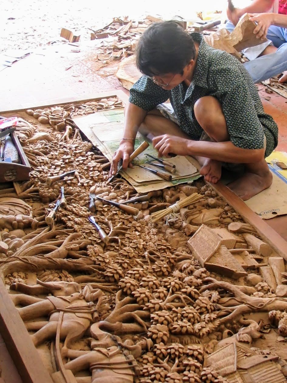 La tappa successiva è un laboratorio di falegnameria dove abilissimi scalpellini realizzano magnifici bassorilievi in tipico stile thailandese su legno di teak. Ci sono ordinativi da ogni parte del mondo e le dimensioni dei pannelli vanno dalla piastrella a diversi metri quadri. Queste opere posso piacere o meno ma è innegabile l’abilità e la pazienza di questi intarsiatori: ormai penso che solo in queste parti del mondo siano rimasti artigiani in grado di fare lavori come questi, con tanta perizia e professionalità, con stipendi bassissimi: ci sarà pure un motivo per cui noi occidentali ne approfittiamo… no comment!
