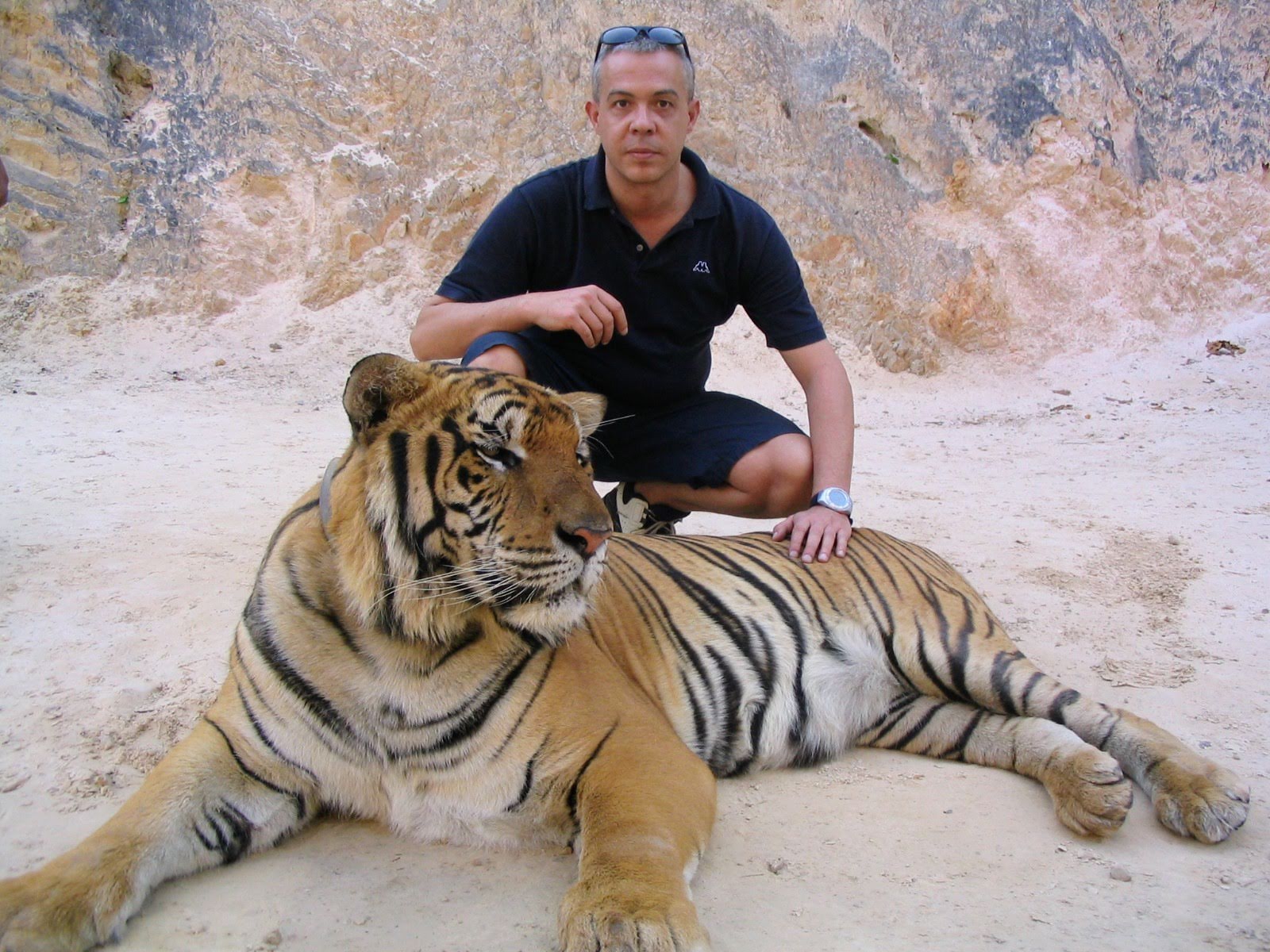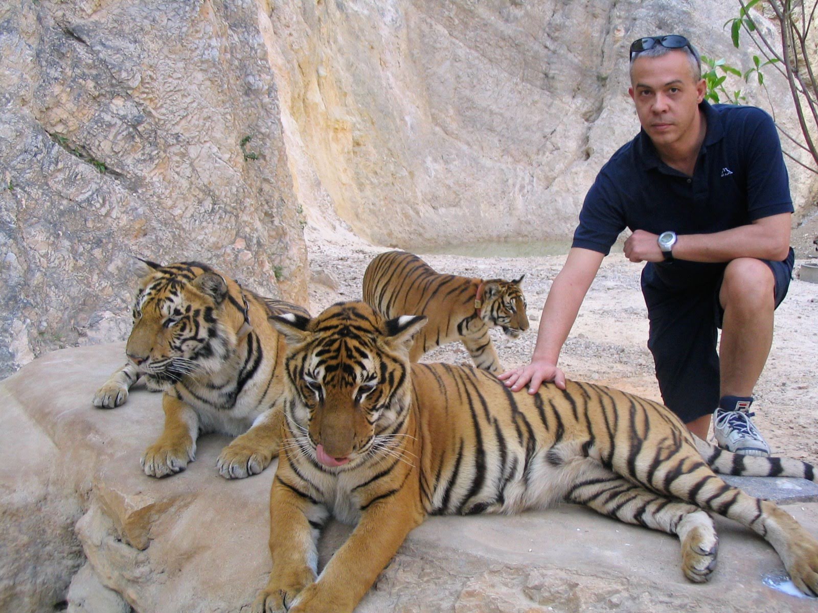 Mario non parla italiano ma ci intrattiene, durante le due ore di viaggio, raccontandoci qualcosa in inglese sulla sua terra, sulla grandezza del re e su quanto ha fatto per il popolo. Tiene una lezione sulle noci di cocco: in pratica, quelle che arrivano da noi, quelle marroni per intenderci, sono i loro scarti; delle noci di cocco, qui, la parte principale non è la polpa ma il latte che viene utilizzato in cucina o come bevanda: infatti nei bar vengono servite noci verdi, aperte in cima, dove con la cannuccia si beve il succo o, se ghiacciate, si mangia tipo granatine, prenderò presto l’abitudine di ordinarle regolarmente. Kanchanaburi è una cittadina molto estesa e la ricerca dell’hotel non è facile, nonostante abbia tutti i bigliettini, stampati a casa, con l’indirizzo scritto in thai. Fortunatamente, passandoci davanti, riconosco la facciata che avevo visto su una foto su internet. La camera è decisamente più modesta rispetto all’hotel di Bangkok ma pur sempre dignitosa e pulita e con quella cura per il dettaglio tipica di queste zone. Nonostante sia già passato mezzogiorno, riusciamo a scroccare gli avanzi della colazione e a riempirci la pancia. Alle 15 passa a prenderci il tuk-tuk taxi (un’Ape Piaggio con i sedili) per il primo tour: sto per vivere una delle esperienze più entusiasmanti della mia vita! La meta è il Tiger Temple. Nostri compagni di viaggio due ragazzotti americani accompagnati da due ragazzine locali: i loro discorsi vertono esclusivamente su argomenti di carattere sessuale e vengo interpellato solo per tradurre in italiano l’espressione f**k! Il Tiger Temple dista circa 40 km: il viaggio dura circa un’ora ed è divertente sfrecciare su questo trabiccolo che arranca in salita.Il Tiger Temple è un luogo dove i monaci buddhisti accudiscono le tigri orfane o ferite trovate nella giungla. Durante il giorno, le tigri vengono tenute libere all’interno di una cava-canyon osservate e nutrite da numerosi assistenti, durante la notte vengono rinchiuse in grandi gabbie solo per evitare che si allontanino. E’ in progetto la costruzione, grazie al ricavato dei biglietti di ingresso (300 bath) e delle offerte, di un parco circondato da un profondo fossato in modo da permettere alle tigri di restare libere anche la notte. Si accede al canyon attraverso una gola rocciosa e arida. Arriviamo davanti alle tigri dalle quali restiamo ancora separati da una transenna. Le tigri indossano tutte un collare e, quando qualcuna diventa un po’ nervosa, viene legata a catene ancorate al terreno o alla roccia: dopotutto sono e restano animali selvatici, anche se parzialmente abituate all’uomo. Veniamo fatti entrare uno di seguito all’altro e ognuno di noi ha un assistente personale che non si allontana mai troppo e si occupa di scattare le foto con la nostra fotocamera per immortalare i nostri 10 minuti di gloria. La cosa strana è che nessuno ha tentennamenti o rinuncia ad entrare: forse è la tranquillità della situazione… o forse la rassegnazione. In circostanze diverse penso che nessuno si avvicinerebbe a questi animali.