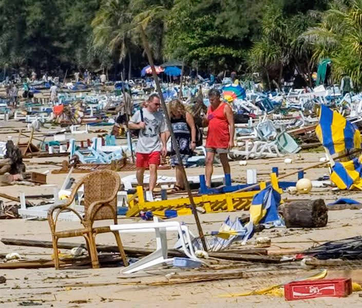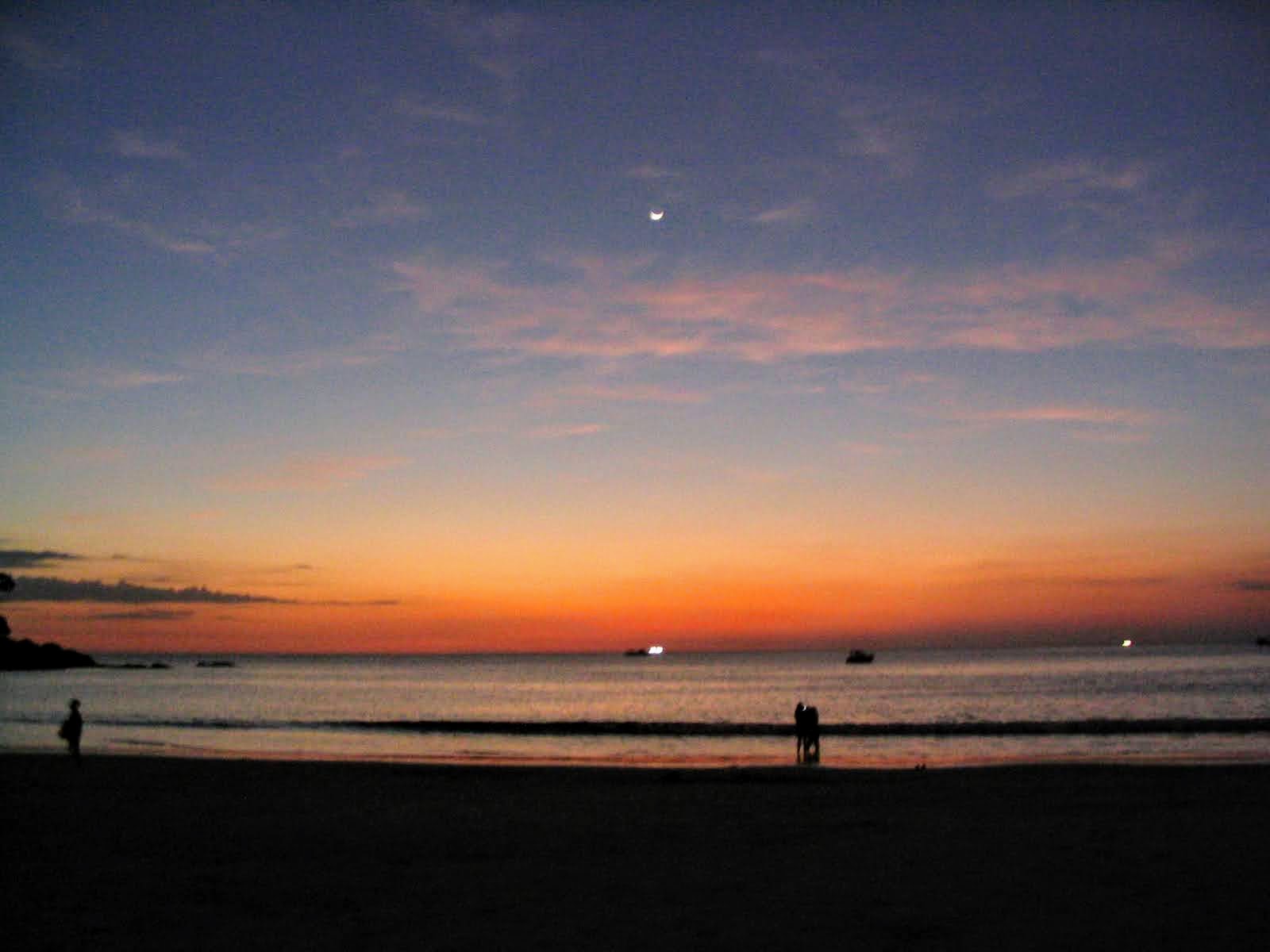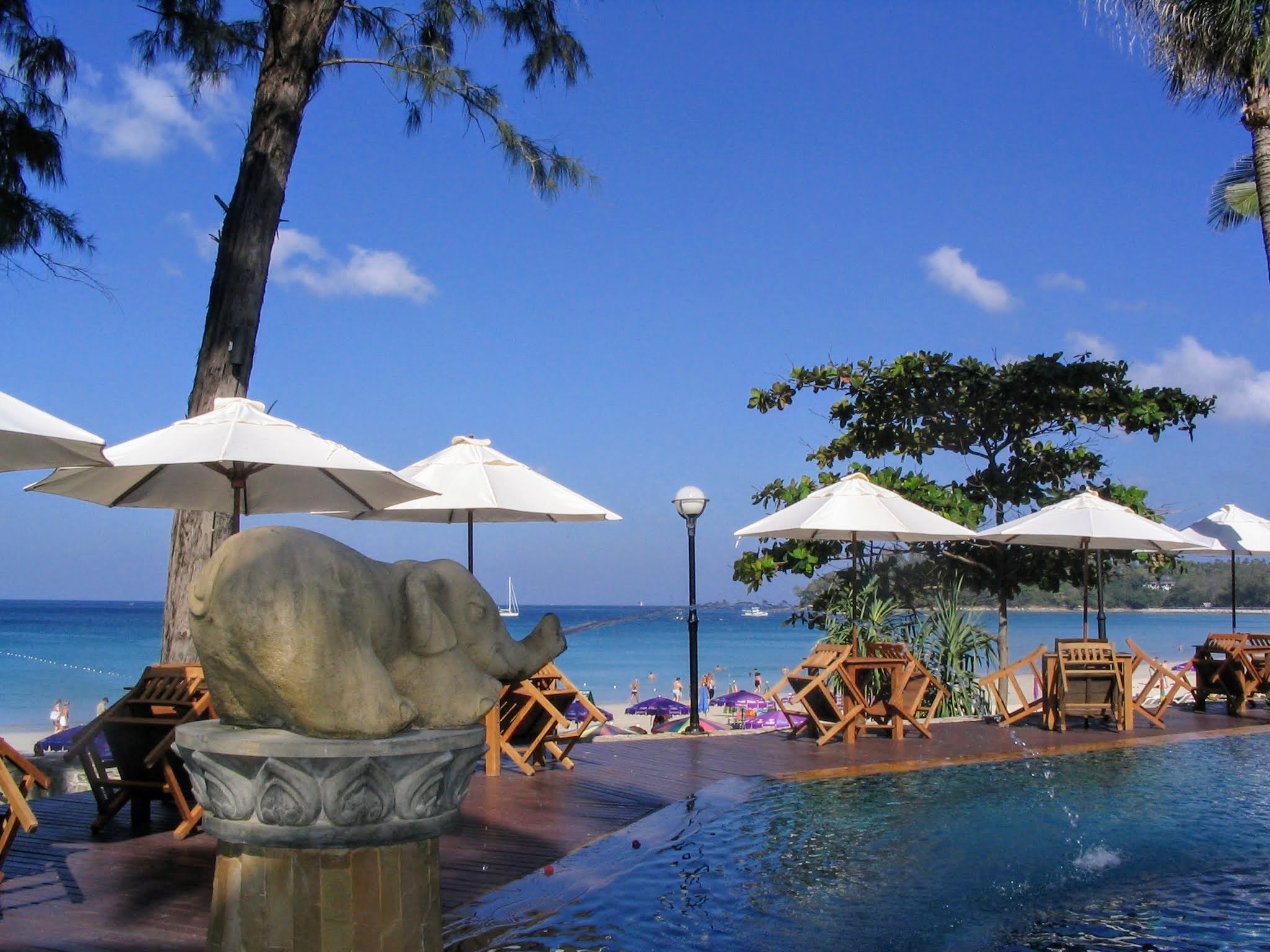 La spiaggia è tre gradini più sotto: la sabbia è bianca e sottile e l’acqua del mare trasparentissima, colore smeraldo. Dalla spiaggia, gli hotel e i resort sono discretamente nascosti da una folta vegetazione di palme e altre piante. La cosa che si nota maggiormente sono i tralicci, bianco-rossi, con in cima le sirene per eventuali allarmi tsunami. E’ impressionante pensare che, solo 13 mesi fa, qui a Phuket fosse tutto distrutto: la spiaggia devastata, gli hotel, le camere, le strade e i negozi pieni di fango, con auto capovolte e accartocciate e, purtroppo, centinaia di cadaveri. altrettanto impressionante è vedere come, in così poco tempo, non vi sia la minima traccia di quanto è successo: è tutto pulito, in ordine, le strutture alberghiere sono state completamente rimesse a nuovo. E mi viene spontaneo pensare se da noi, in Italia, sarebbe stato così. Le esperienze di recenti catastrofi naturali mi fanno propendere per il no.
