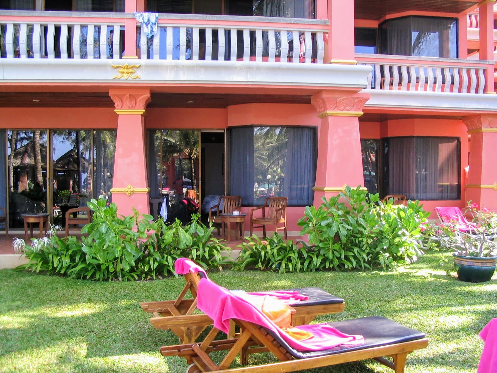 La maggior parte dei viaggiatori sono giovani ragazzi con zaino e scarponi da trekking. Il treno, secondo le indicazioni che avevo raccolto, dovrebbe portarci proprio alla stazione dell’aeroporto Don Muang. La carrozza, a differenza del trenino turistico alla Ferrovia della Morte, è quasi vuota. Qualcuno dorme sdraiato sui sedili in legno, probabilmente ha viaggiato tutta la notte e proviene dal nord. Sul soffitto c’è il tradizionale ventilatore a pale. Ogni tanto passano hostess con scatole piene di bomboloni fritti e glassati o mazzi di fiori. In un’ora arriviamo alla stazione di Don Muang ed effettivamente, dopo aver attraversato una passerella sopraelevata, arriviamo al terminal dei domestic flight. Continuano a rimandare la partenza del nostro volo Thai, solo il nostro, e alla fine riusciamo a partire con più di due ore di ritardo. In poco più di un’ora e dopo un atterraggio un po’ frettoloso, arriviamo a Phuket. L’aeroporto si trova a nord dell’isola mentre l’hotel che abbiamo prenotato è situato a sud, a Kata Beach, a circa 50 chilometri. A quanto pare i trasferimenti hanno un prezzo statale prestabilito, perciò prendiamo un macchinone, dove posso addirittura tenere la gambe distese anche seduto dietro, che per 500 bath ci porta a destinazione. L’autista, un distinto signore in giacca, ci intrattiene raccontandoci la terribile esperienza dello tsunami del 26 dicembre 2004, appena 13 mesi fa, che nella sola Thailandia ha fatto circa 7000 vittime. Chiede un paio di volte di potersi fermare: entra in un ufficio e, puntualmente, esce una ragazza che ci propone qualche tour dell’isola, evidentemente l’autista ha una percentuale. Alle fine, non resiste e chiede se vogliamo la compagnia di qualche (non una!) ragazza o lady-boy per la sera! E’ evidente che la prostituzione è il maggiore affare turistico della Thailandia! Arriviamo all’hotel che sono ormai le 18 e… ooohhh!!! La lobby è da togliere il fiato! In genere, per scelta, non posto le foto degli hotel dove alloggio ma questa volta faccio uno strappo alla regola, merita veramente.